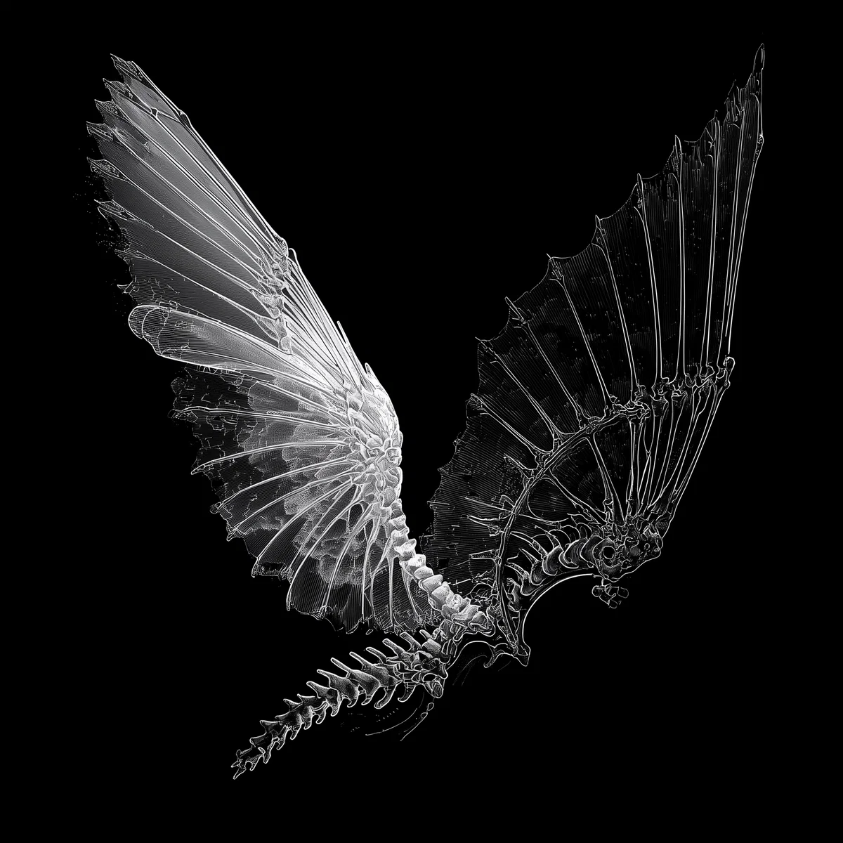 Transform your space with this striking illustration of asymmetrical wings that beautifully blend organic and biomechanical elements. One side features a skeletal bone wing, while the other showcases a delicate thin membrane wing, creating a captivating contrast that draws the eye. The highly detailed black ink style stands out against a clean, dark background, making it a perfect piece for those who appreciate unique wall art.