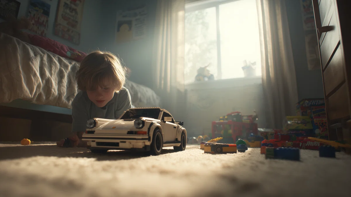Step into a moment of childhood wonder with this captivating image of a young boy immersed in play, holding a LEGO-style Porsche 911 in his bedroom. The photorealistic scene is beautifully crafted, echoing the cinematic style of Christopher Nolan’s Interstellar, making it a striking addition to any wall art collection. The rich textures and warm tones create a nostalgic atmosphere that resonates with both children and adults alike.