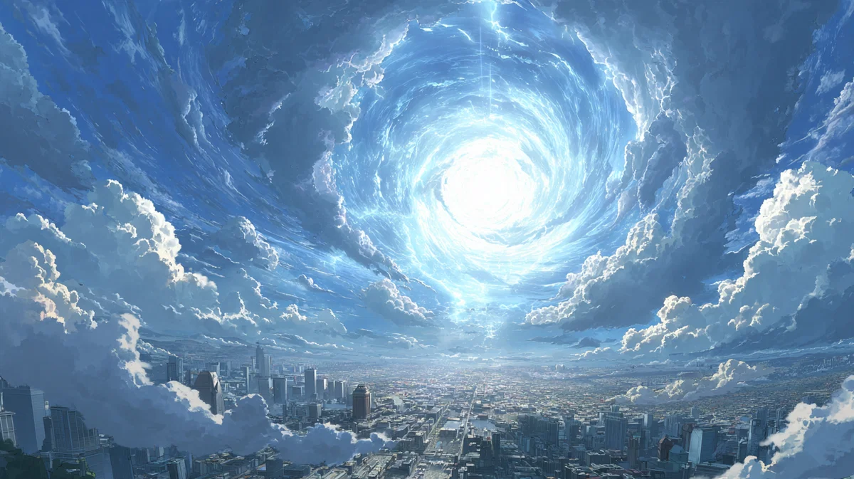 Step into a mesmerizing world with this stunning illustration of a futuristic city floating in space. The towering buildings rise majestically above a sea of fluffy white clouds, surrounded by swirling light blue energy that adds an ethereal touch. Above, a massive swirl of glowing white magic creates a captivating focal point, bathing the scene in a warm, inviting glow. This high-quality, cinematic artwork captures the essence of adventure and wonder, making it a perfect centerpiece for any space.
