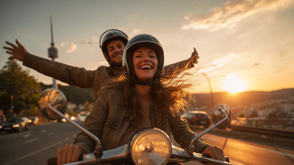 Capture the joy of adventure with this stunning image of a young couple riding a Vespa through the picturesque city of Stuttgart at sunrise. The dynamic shot showcases the male driver’s infectious smile as he navigates the streets, while the woman in the back throws her arms up in pure delight, her long hair dancing in the wind. The iconic TV tower and the warm hues of the rising sun create a beautiful backdrop, adding a cinematic touch to this lively moment.