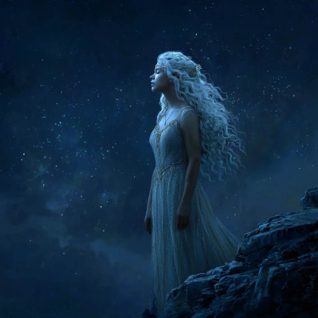Step into a world of enchantment with this stunning illustration of a young elven woman, perfect for any dark fantasy lover. With her long, curly white and silver hair cascading down her back, she stands gracefully atop a cliff, dressed in a shimmery pearl silk gown that catches the starlight. The iridescent blue of her eyes draws you in, making it impossible to look away. This piece captures the essence of fantasy art, blending intricate details with a captivating atmosphere.