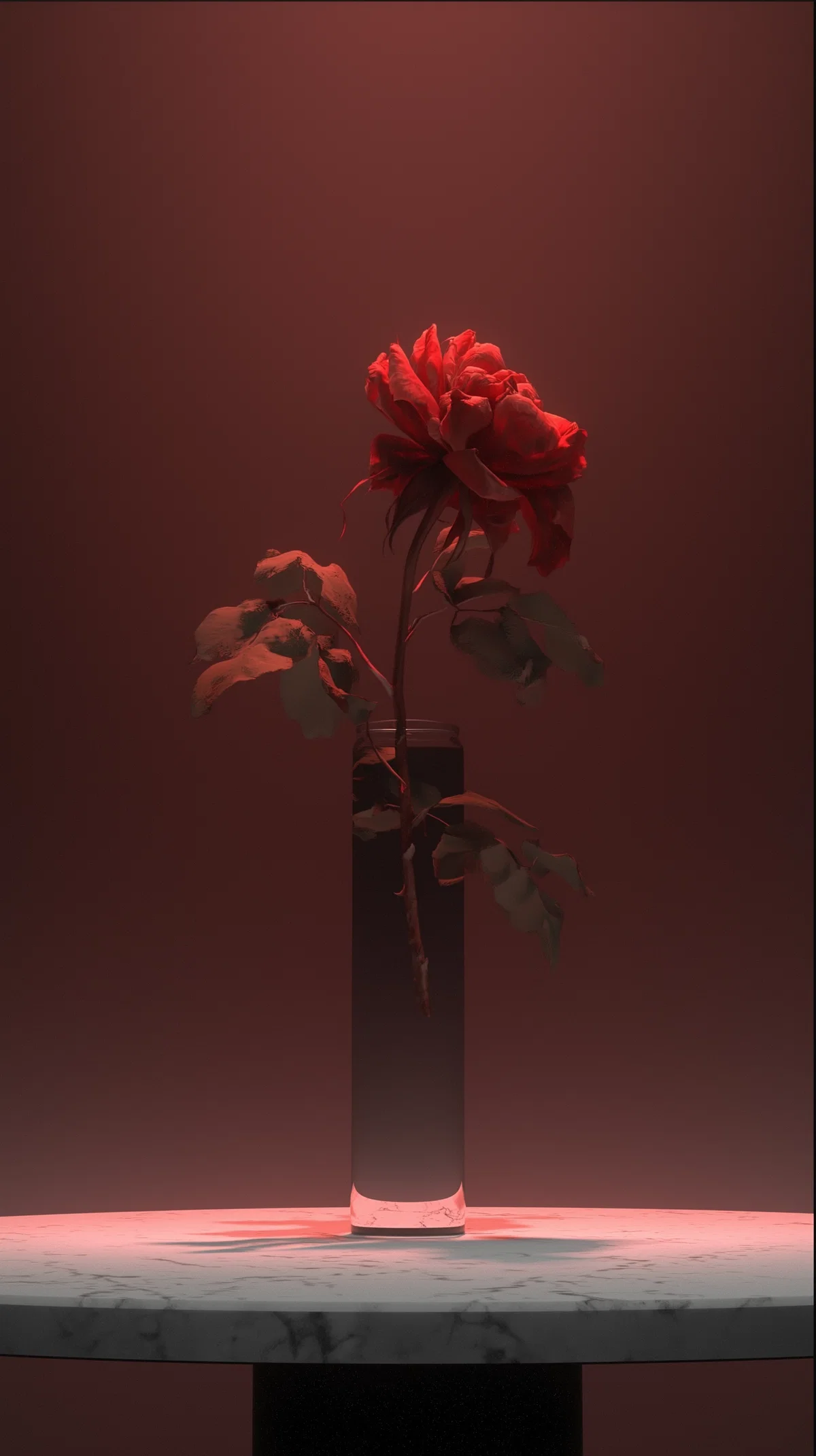 This image features a beautifully withered rose, elegantly displayed in a transparent cylindrical vase. The muted tones of the dried petals contrast perfectly with the simplicity of the vase, creating a striking focal point against the plain background. This minimalist aesthetic captures the essence of natural beauty and imperfection, making it a perfect addition to any decor style.