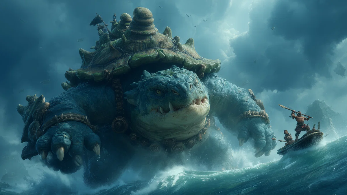 Immerse yourself in the epic world of Dota 2 with this stunning illustration of the colossal Tidehunter. Captured from a low angle, the artwork showcases the immense scale of this mythical beast as it towers over tiny heroes and units, set against a backdrop of a stormy sea. The dramatic thunder clouds and crashing waves create an oppressive atmosphere, perfectly highlighting Tidehunter’s rough stone skin and massive shell armor.