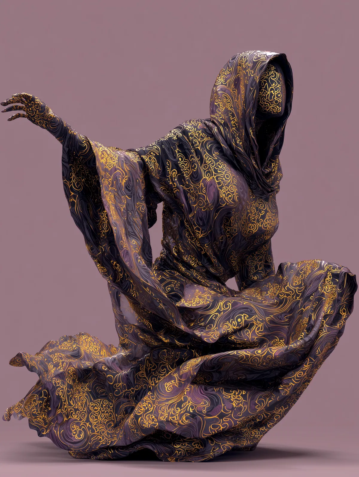 Transform your space with this stunning illustration of an ethereal woman composed of golden energy, gracefully posed in an arabesque position. The swirling black and dark purple fabric adds a dramatic contrast, creating a captivating visual that draws the eye. This artwork encapsulates a mystical vibe, perfect for anyone who appreciates fantasy aesthetics and unique decor.