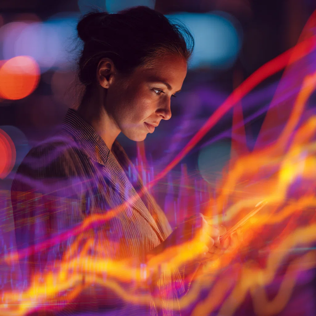 Imagine a vibrant scene where a woman confidently manages her finances on her phone, surrounded by swirling images of bank and finance data technology. This striking photograph, captured with a Nikon D850, showcases a futuristic aesthetic that combines rich purples, fiery oranges, and bold reds. The dynamic colors and digital motifs create an energetic atmosphere, making it an eye-catching addition to any modern space.