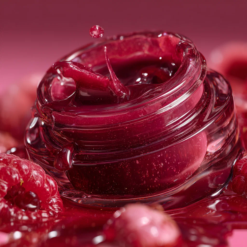 Indulge in the luxurious allure of this stunning beauty product photography. The image showcases a sleeping lip balm with its lid artfully open, revealing a thick, glossy texture that appears to melt in the light. Crushed raspberries ooze their rich juice, creating a captivating visual as the viscous liquid flows and merges seamlessly with the balm. The deep raspberry and soft pink color palette, paired with dramatic studio lighting, sets a sensual and rich mood that draws you in.
