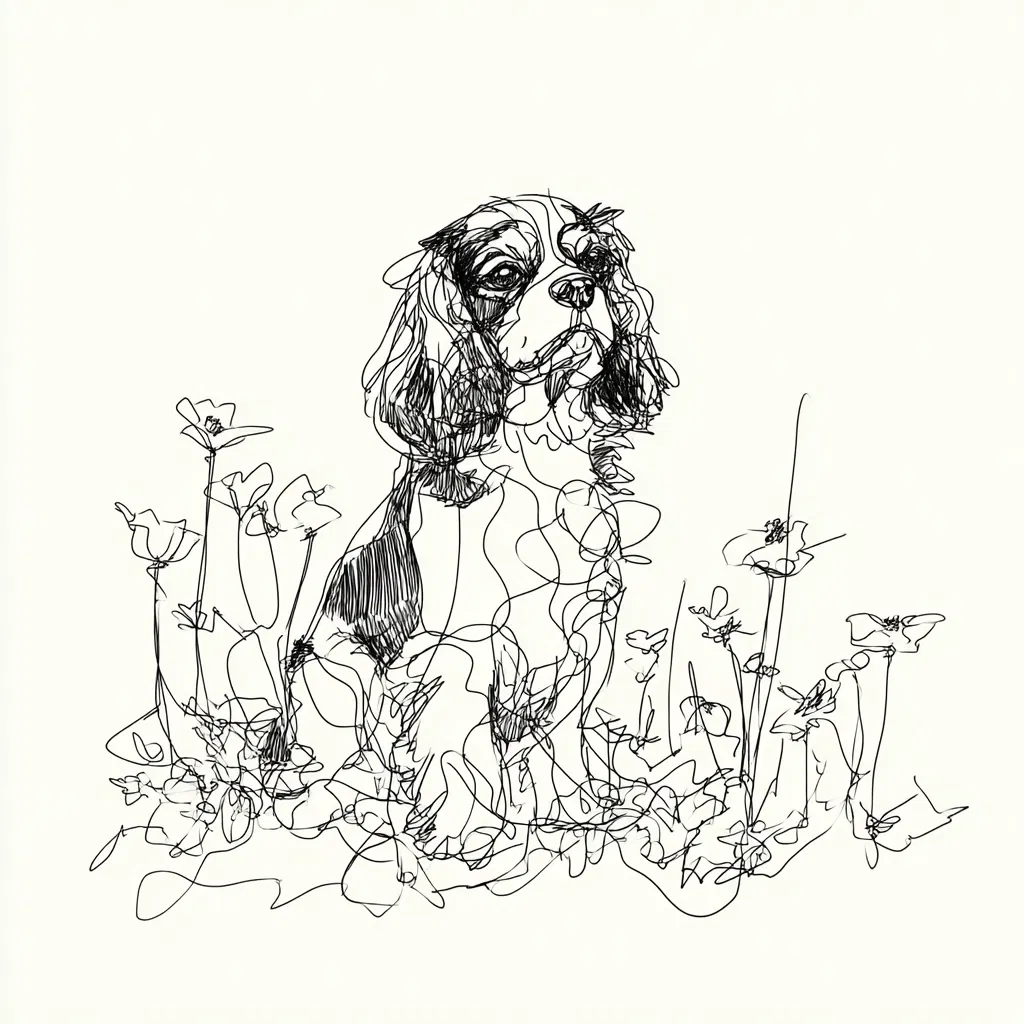 This charming line art illustration features a King Charles Cavalier, captured in a playful and whimsical style. The continuous ink sketch embraces a minimalist approach, showcasing the dog’s goofy personality through messy lines that add character and charm. Set against a backdrop of delicate flowers, this piece effortlessly combines the beauty of nature with the lovable quirks of our furry friends.