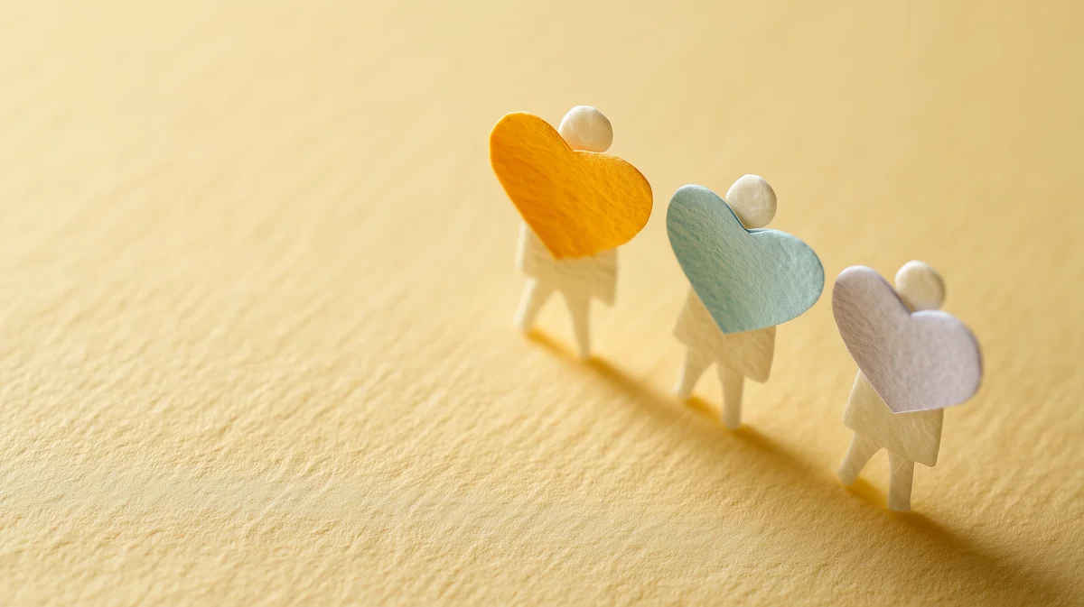 This stunning piece of minimalist paper art captures a serene moment with its isometric perspective and high-quality craftsmanship. Three delicate white silhouettes stand in a diagonal row, each cradling a heart-shaped paper piece that glows softly in amber, cyan, and pale violet. The warm creamy vanilla backdrop enhances the gentle glow, creating an inviting atmosphere that draws you in.