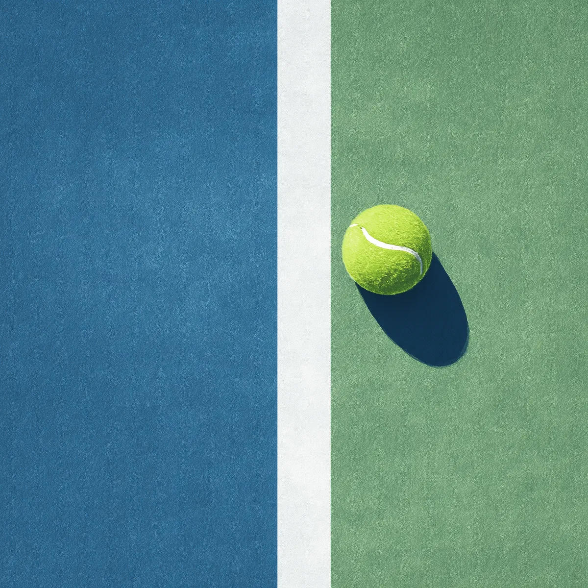 This stunning illustration captures a minimalist tennis court from a top-down view, showcasing a vibrant blend of green and blue hues. The crisp white lines of the court add a striking contrast, drawing the eye to the central tennis ball that perfectly embodies the spirit of the game. This artwork exudes a fresh and dynamic vibe, making it an ideal piece for any sports enthusiast or lover of modern design.