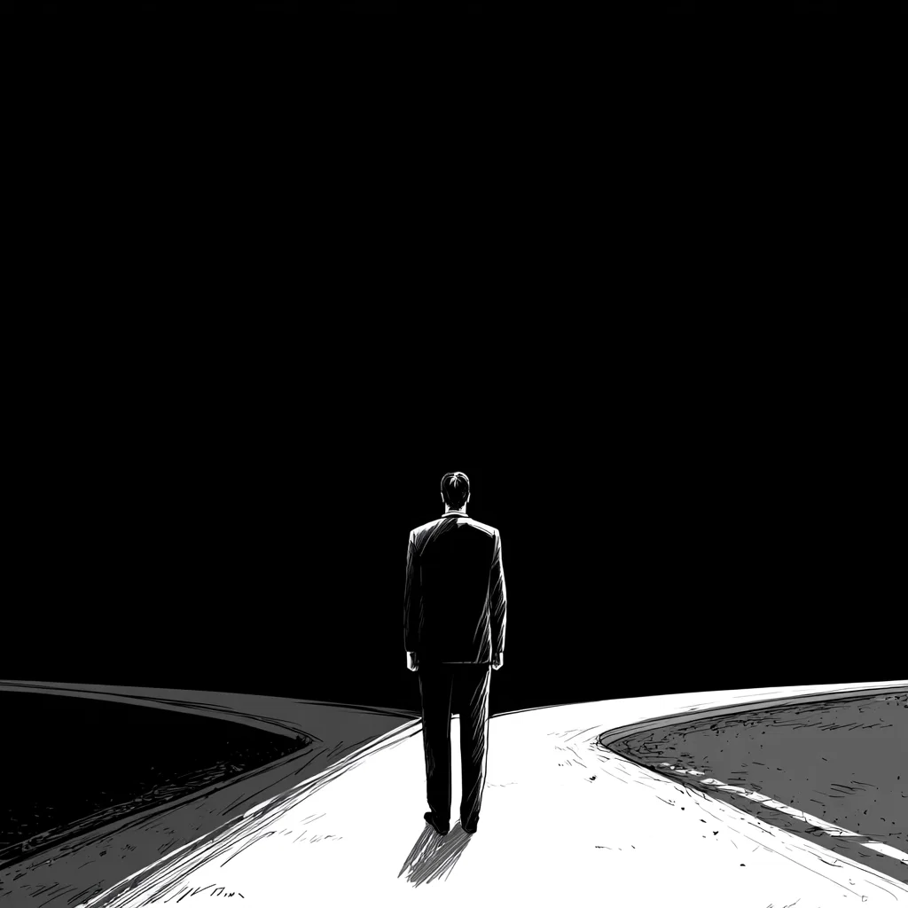 This captivating illustration features a Japanese man in a suit standing at a crossroads, embodying the theme of choices and futures. The scene is beautifully split, with one path leading into darkness and the other illuminated by a bright, promising light. The angle adds depth, making it feel as if you’re looking up at him, emphasizing the weight of his decision. The subtle stubble on his chin adds a touch of realism, making the figure relatable and inspiring.