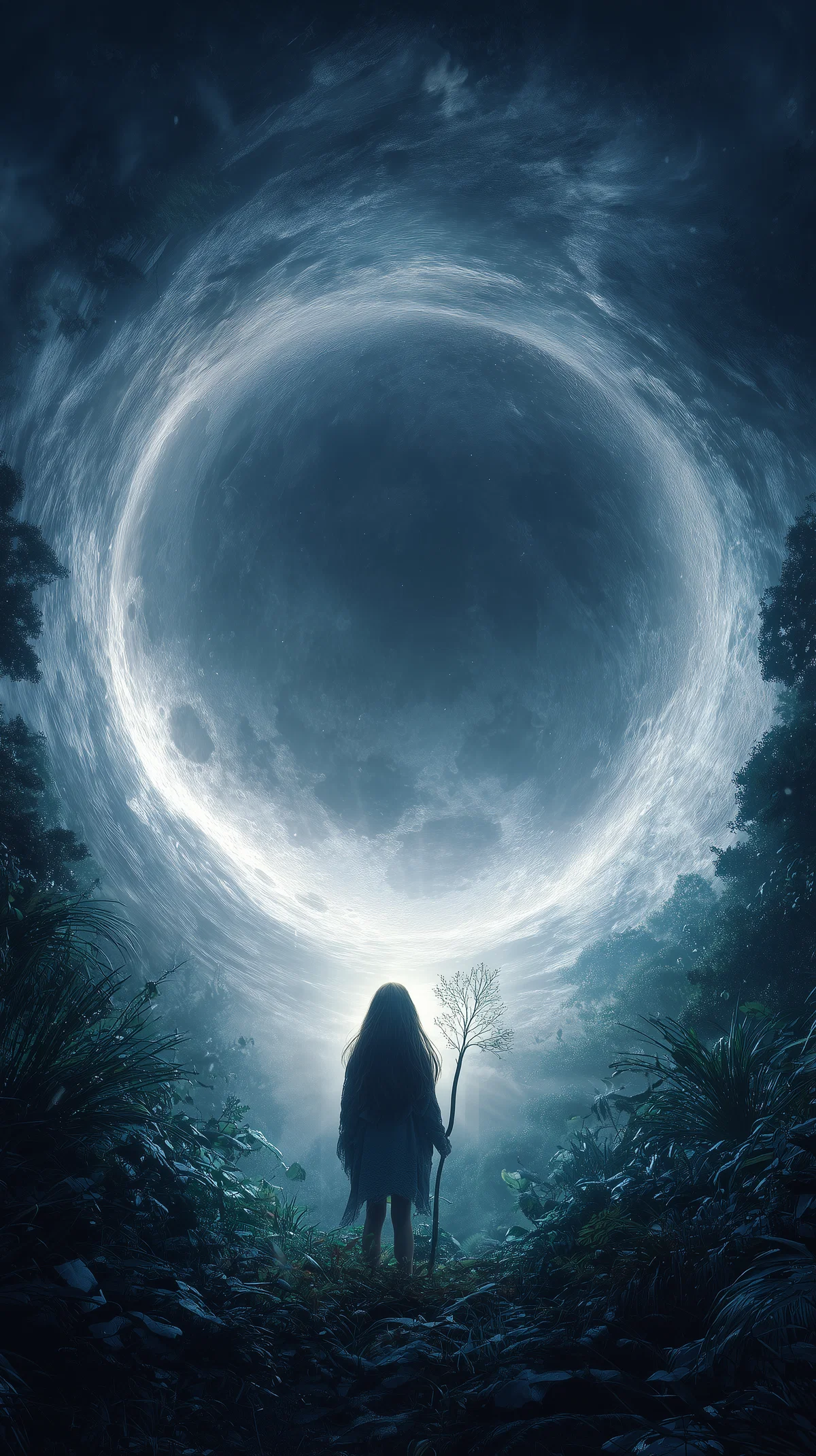 Step into a world of enchantment with this stunning illustration featuring a colossal moon that seems to swirl with mysterious energy. The young druid girl stands in awe, her long silver hair catching the moonlight as she gazes up at the mesmerizing scene. The moon’s vortex-like motion draws you in, creating an eerie yet captivating atmosphere that invites you to explore the depths of this mystical forest.