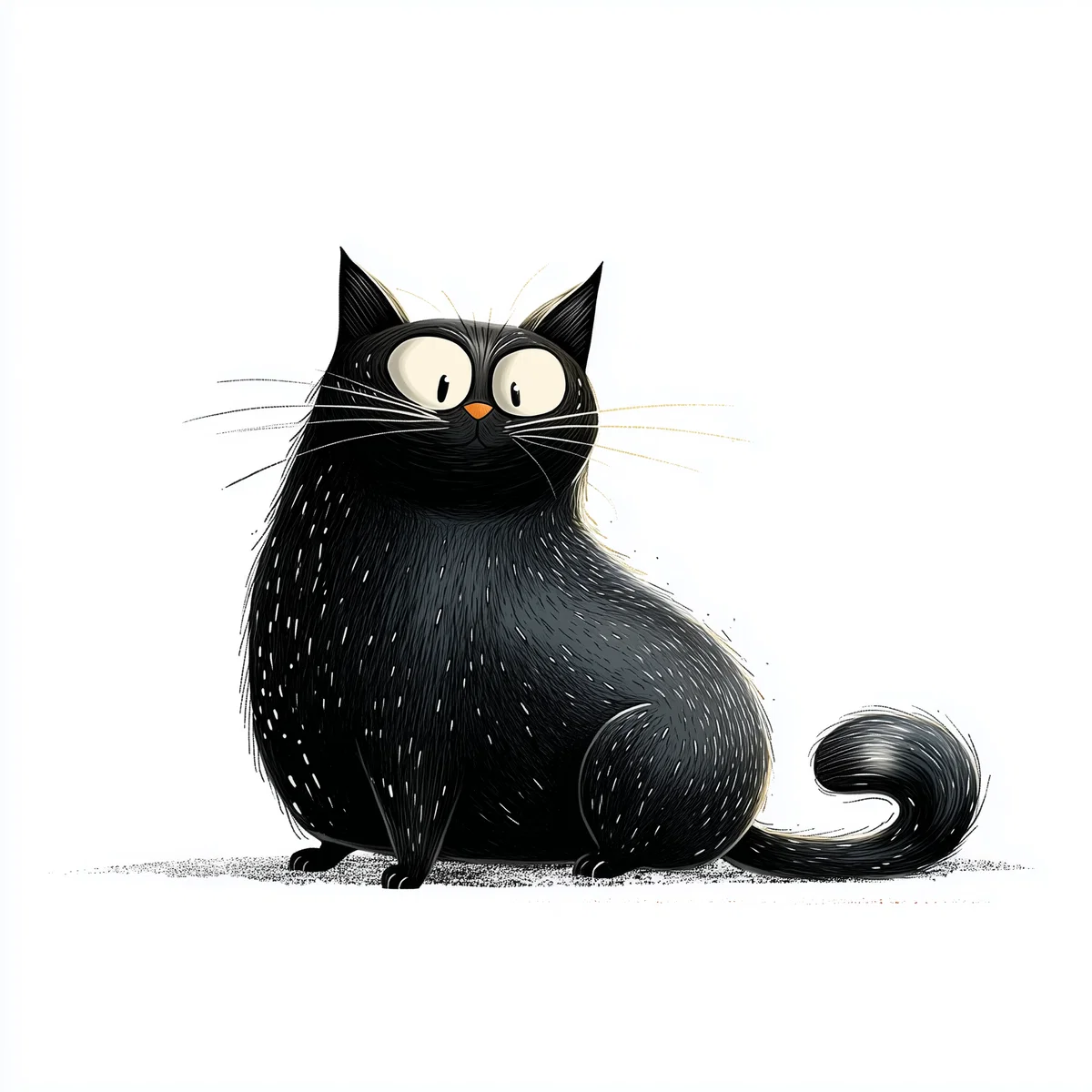 This charming illustration of a stylized black cartoon cat captures the essence of cozy decor with its relaxed posture and happy expression. The cat sits comfortably, its tail wrapped gently around its body, exuding a warm and inviting personality. The textured fur and whimsical design make it a standout piece, perfect for adding a touch of playful charm to any space.