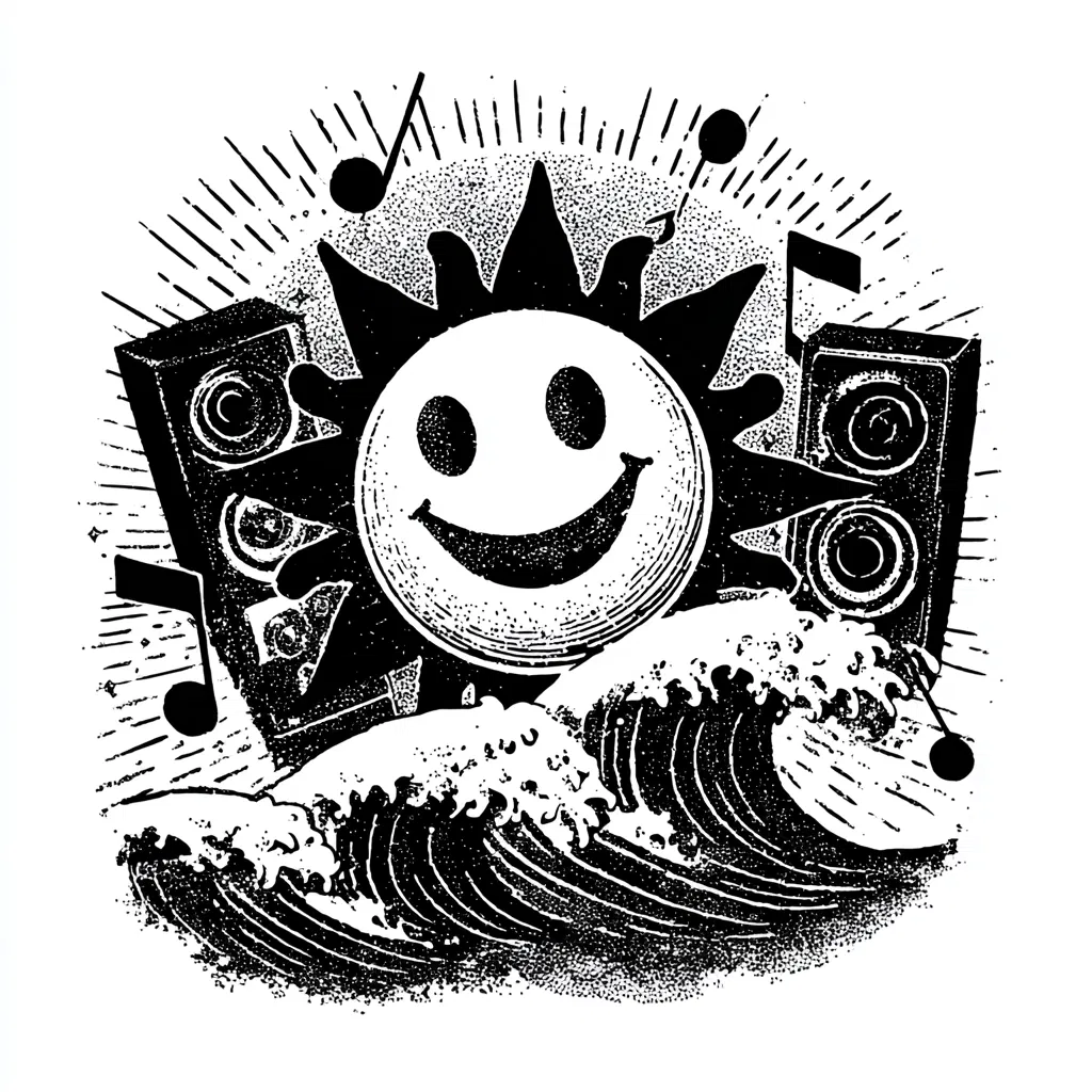 This striking minimalist illustration captures the essence of vintage punk rock with its bold black and white design. Featuring a cheerful sun riding a wave, the high-contrast imagery is enhanced by thick outlines and a unique linocut style. The background speakers and musical notes add a playful touch, making it a perfect piece for music lovers and those who appreciate retro aesthetics.